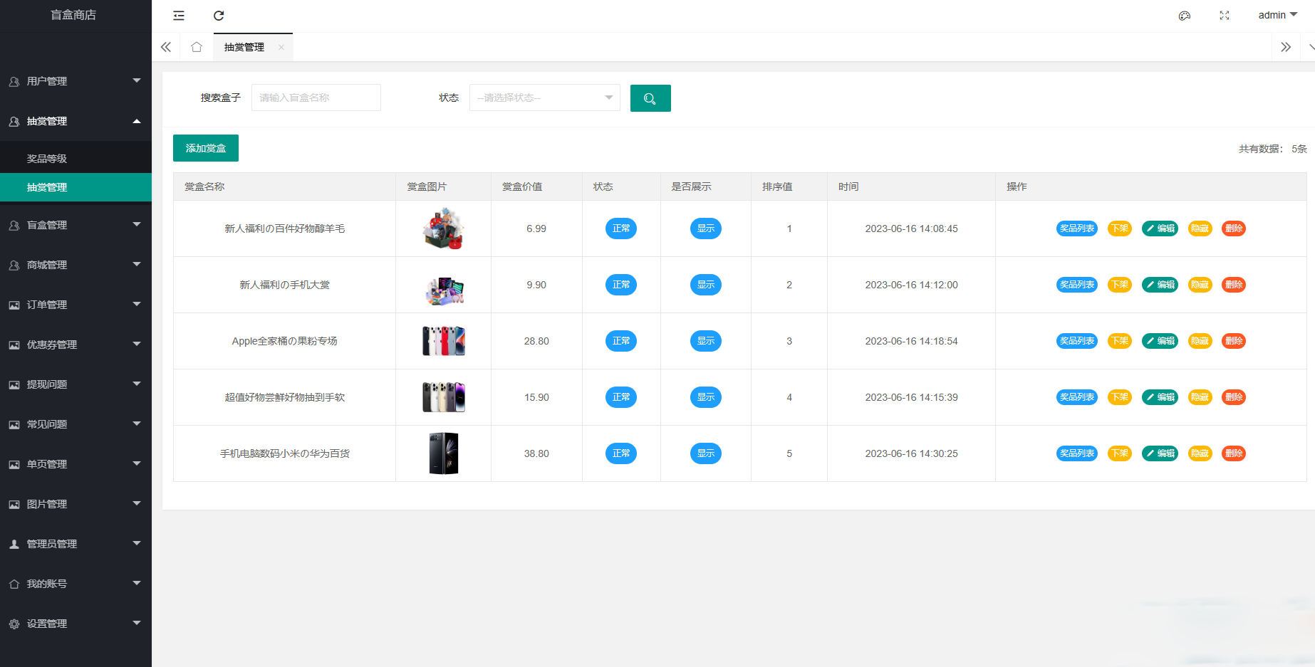 奖池管理:奖品录入、库存管理、概率设置。